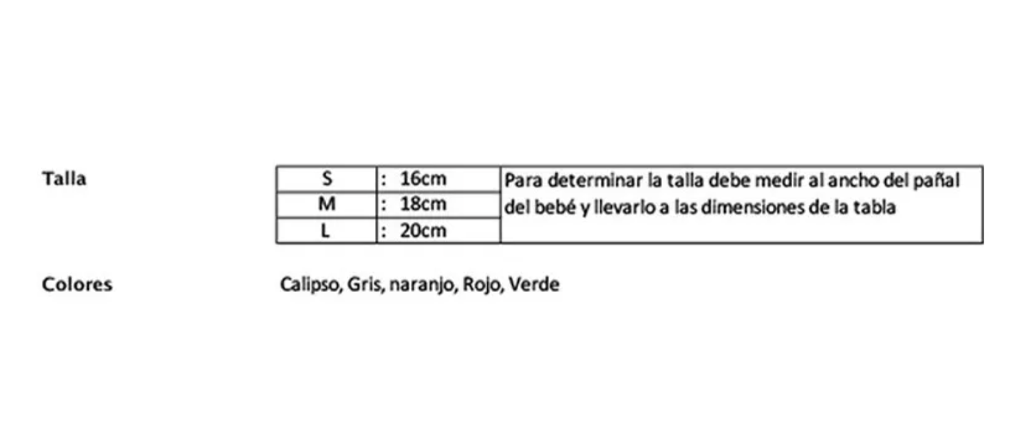 Para determinar la talla se debe medir el ancho del pañal del bebe y llevarlo a la siguiente tabla.