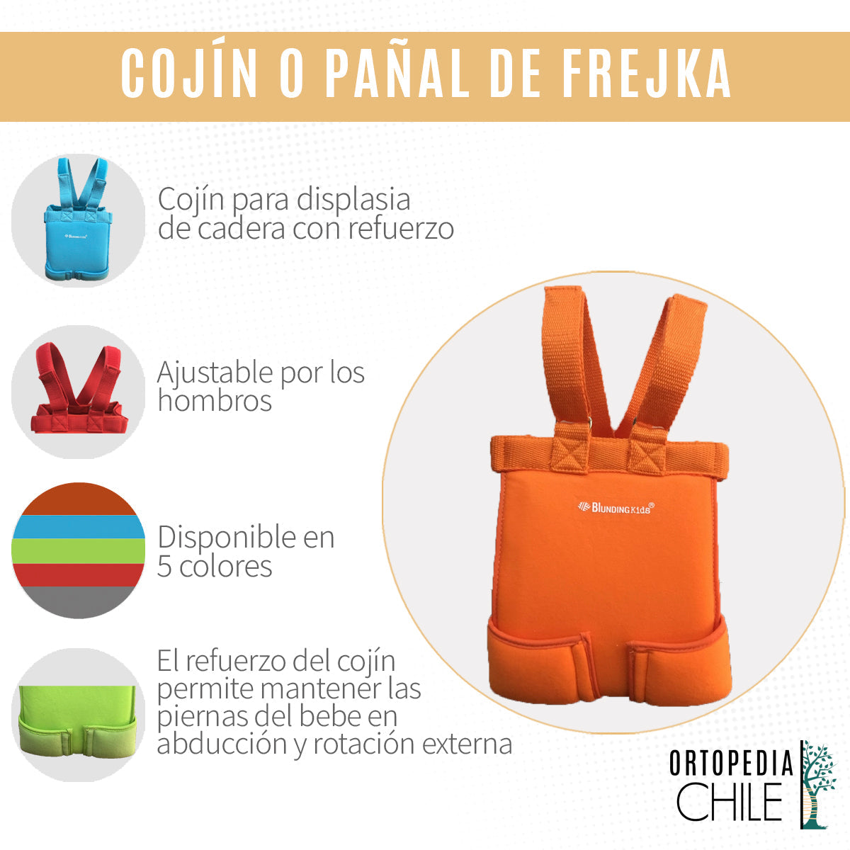 Cojín de Frejka para displasia de cadera es un dispositivo el cual cuenta con un cojín y dos bandas las cuales se fijan en los hombros del bebé, este cojín permite mantener una posición de abducción, rotación externa y flexión de cadera.