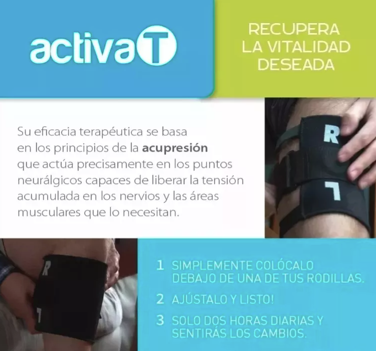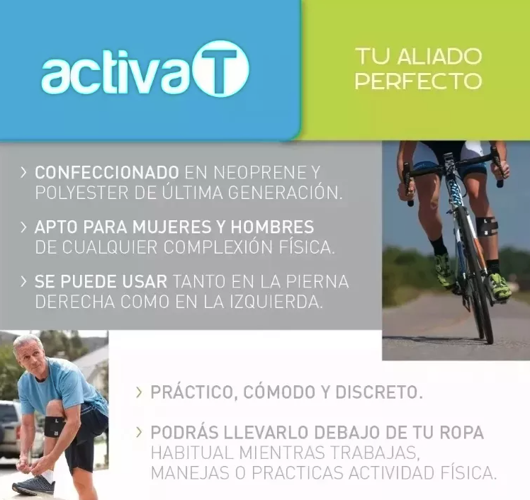 Solo debes colocarlo bajo una rodilla, ajustarlo firmemente y empezar a disfrutar del alivio. Olvídate de pastillas e inyecciones; ACTIVA-T libera la tensión muscular acumulada sin efectos secundarios. Fabricado con neopreno y poliéster de última generación, es apto para hombres y mujeres, y se puede usar en cualquier pierna.