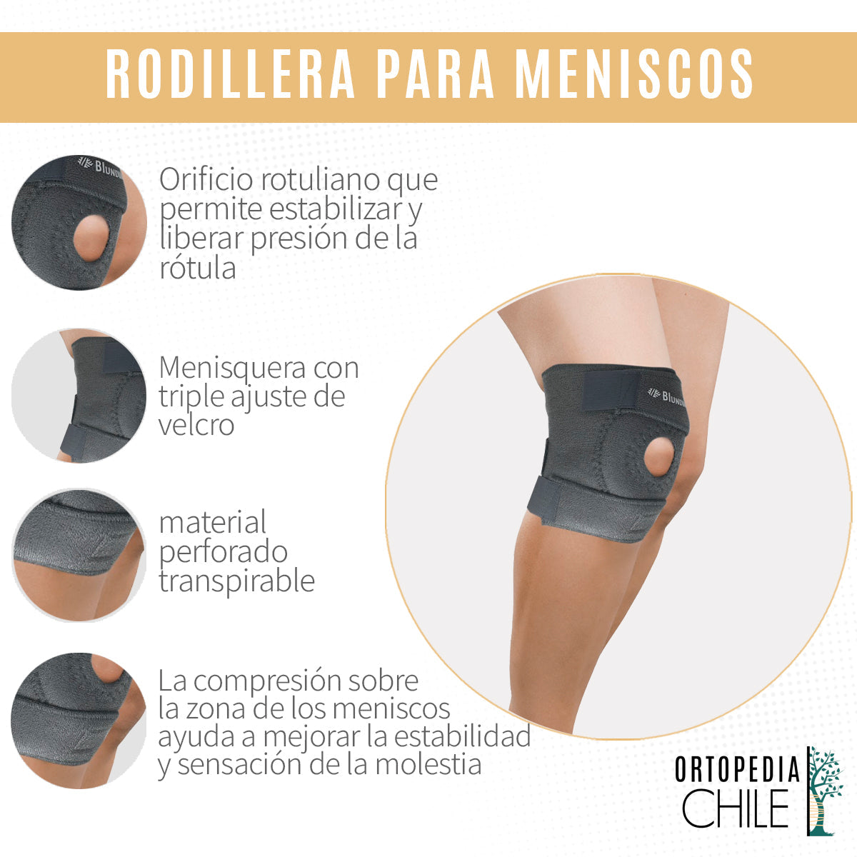 La menisquera con orificio rotuliano Blunding, es un soporte de rodilla que provee compresión sobre la zona de los meniscos, entregando estabilidad y un alivio del dolor en lesiones de meniscos.
